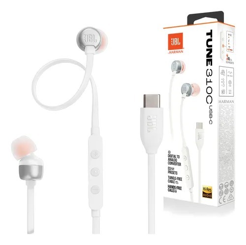 Control remoto en línea con tres botones (reproducción/pausa, volumen, preajustes EQ) y micrófono incorporado.